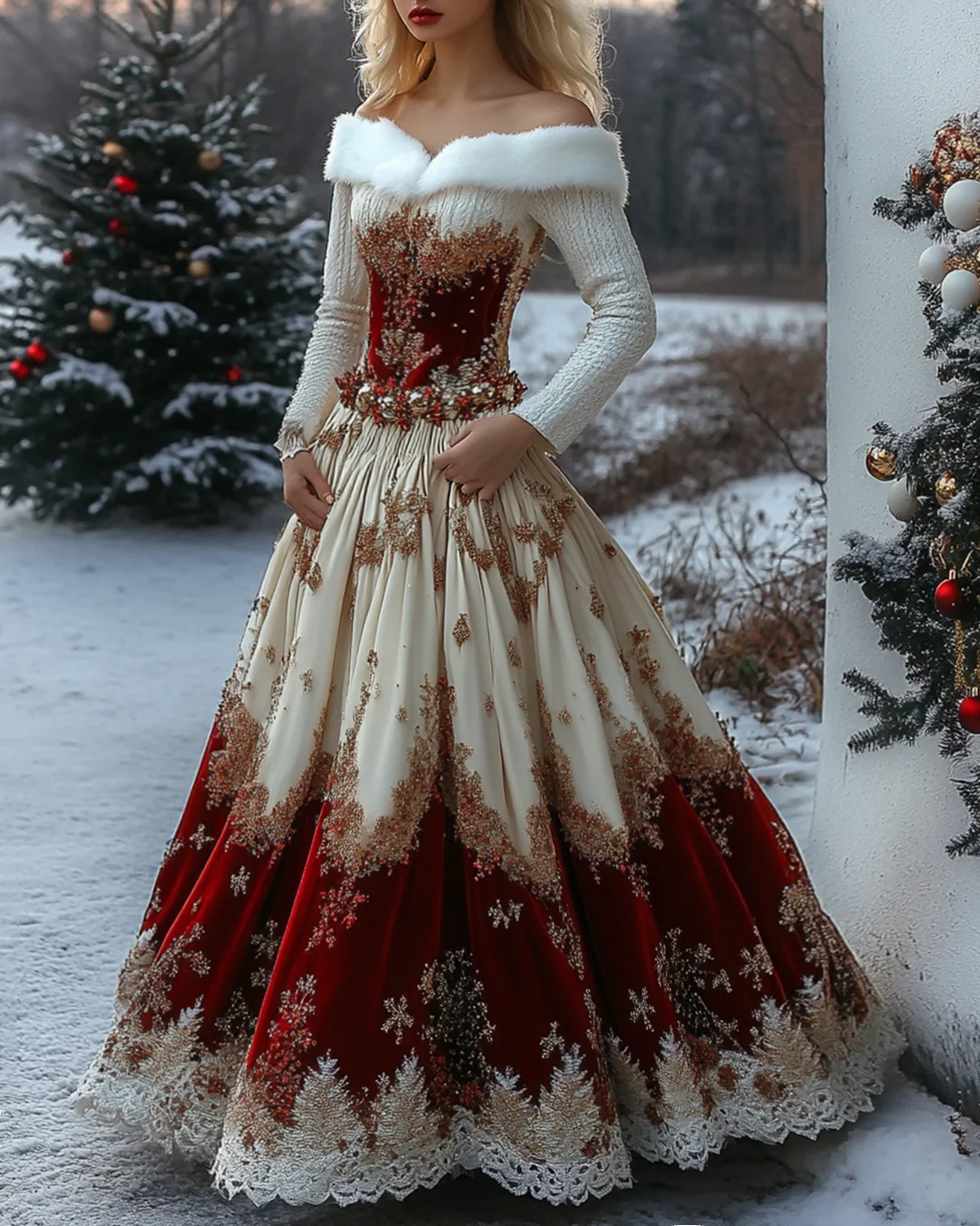 Women's Christmas-Themed Contrast-Color Christmas Bead Embroidered Knit Patchwork Dress 2905