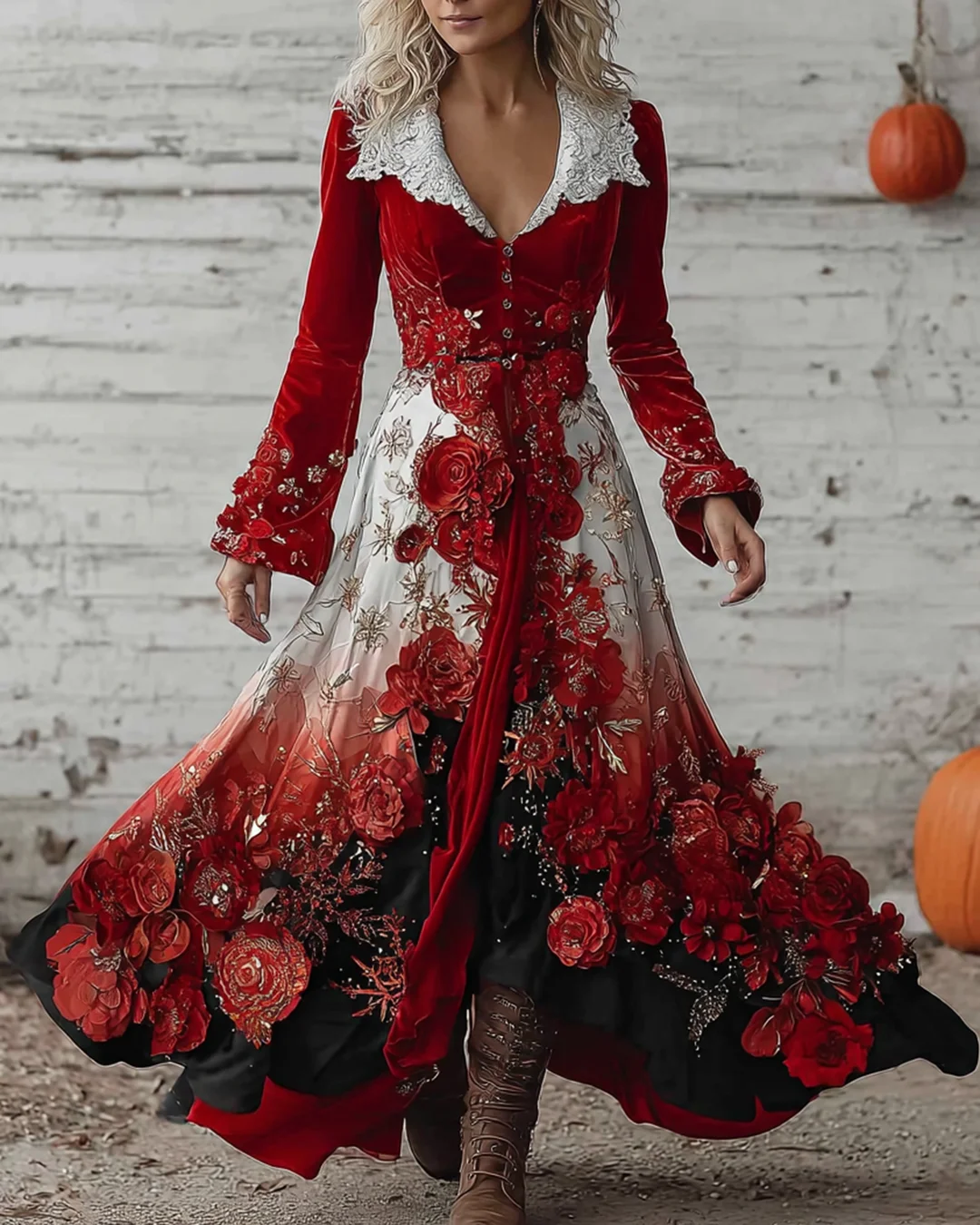 Women's Christmas-Themed Contrasting Color Rose Beaded Embroidered Dress 9557
