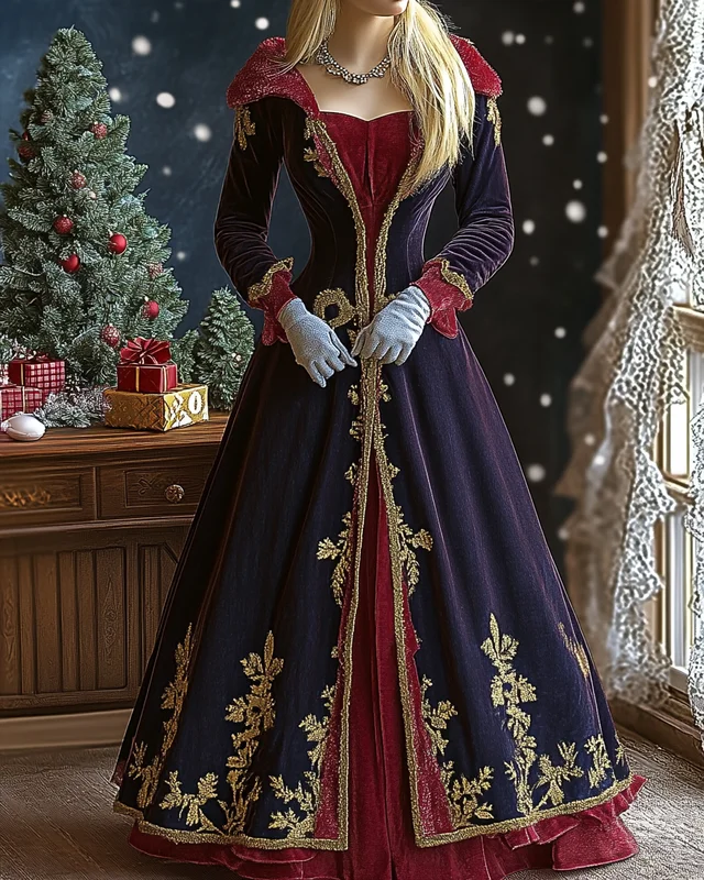 Women's Christmas themed embroidered contrasting color-blocked dress 4811